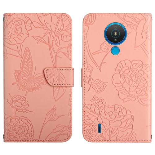 Funda de Cuero en Relieve Peonía y Mariposa para Nokia 1.4 (Rosa)