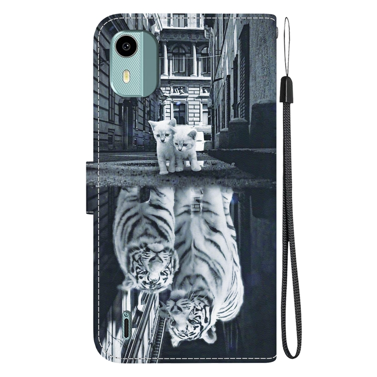 Funda de Cuero para Nokia C12 con Dibujo Coloreado y Textura de Cristal (Reflejo de Tigre Gato)