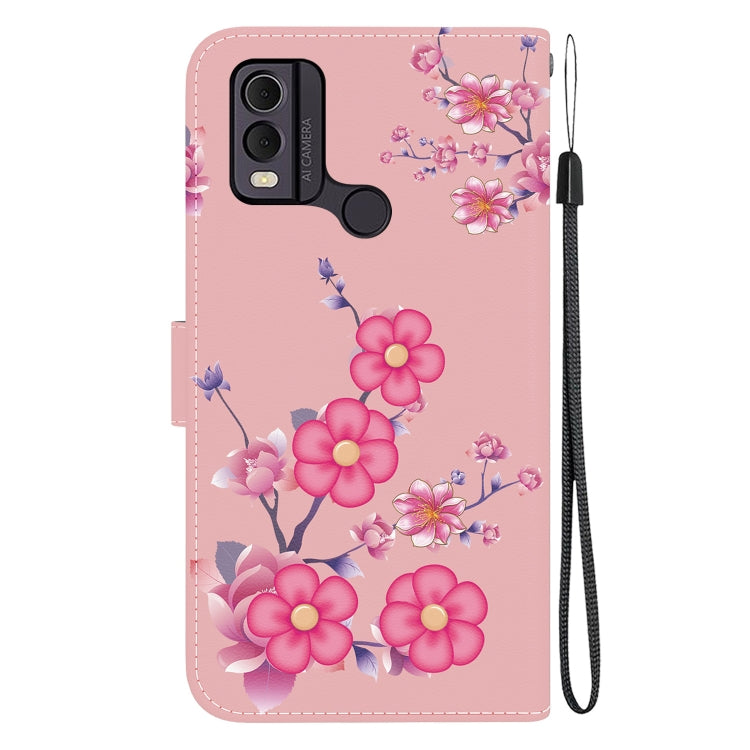 Estuche de Cuero para Nokia C22 con Dibujo Coloreado y Textura de Cristal (Flores de Cerezo)