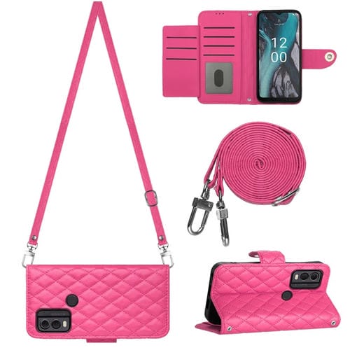 Funda para Nokia C22 de Cuero con Tapa, Textura Rómbica y Cordón Largo (Rojo Rosa)