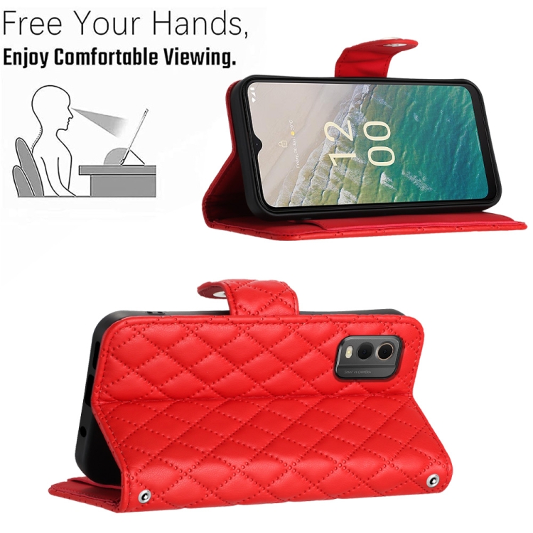 Funda de Cuero para Nokia C32 con Tapa Textura Rómbica y Cordón (Rojo)