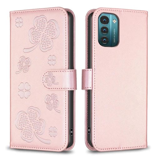Funda para Nokia G11 / G21 de Cuero con Relieve de Cuatro Hojas (Rosa)