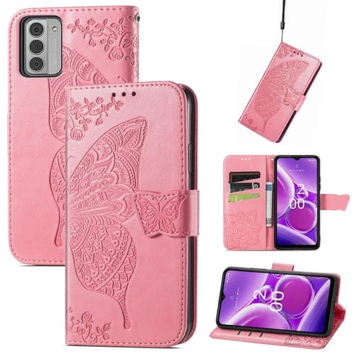 Funda para Teléfono Nokia G42 Cuero con Relieve Flor de Amor y Mariposa (Rosa)