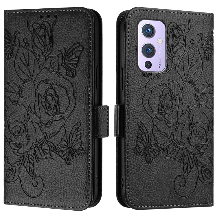 Funda de Cuero Antirrobo RFID para OnePlus 9 con Relieve Rosa (Negro)