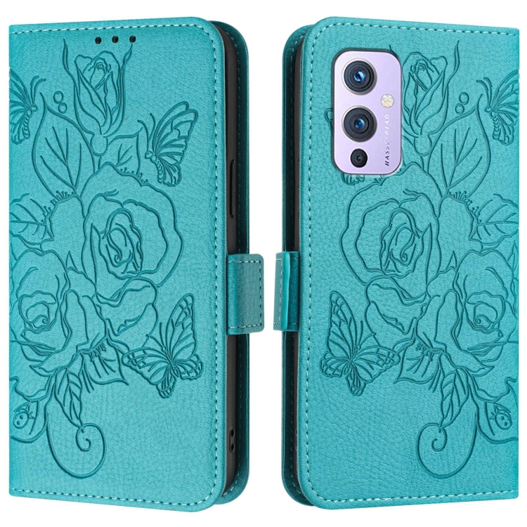 Funda de Cuero Antirrobo RFID para OnePlus 9 Rose en Relieve (Azul Claro)