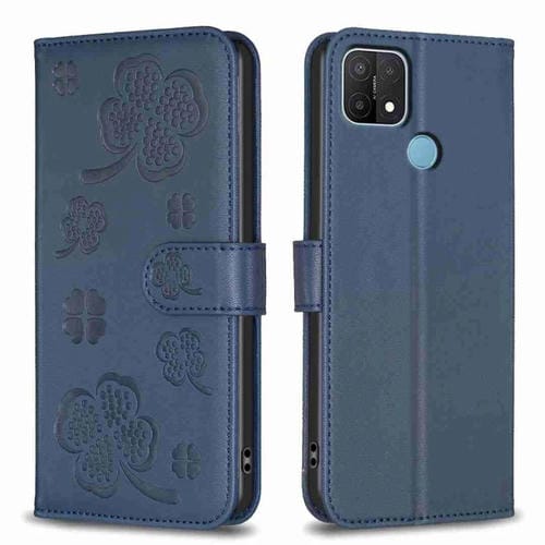 Para Oppo A15 Funda de Cuero con Relieve de Cuatro Hojas (Azul)