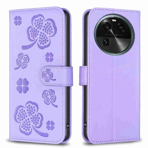 Para Oppo Find X6 Funda de Cuero con Relieve de Cuatro Hojas para Teléfono (Púrpura)