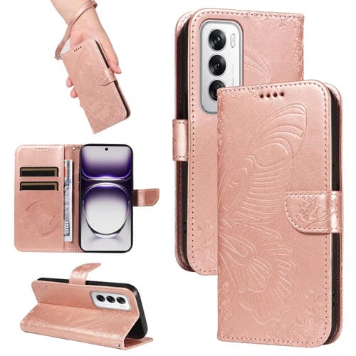 Para Oppo Reno12 5G Global Swallowtail Butterfly Funda de Cuero En Relieve para Teléfono (Oro Rosa)