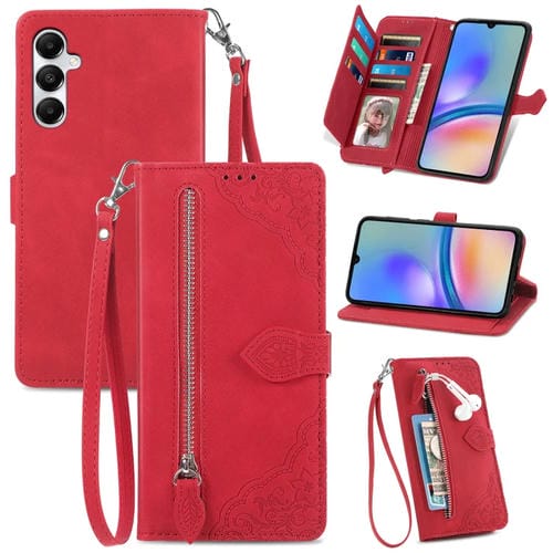 Funda para Samsung Galaxy A05S Cuero Cremallera Flores en Relieve (Rojo)