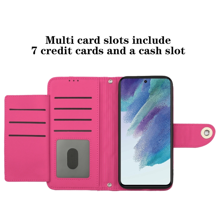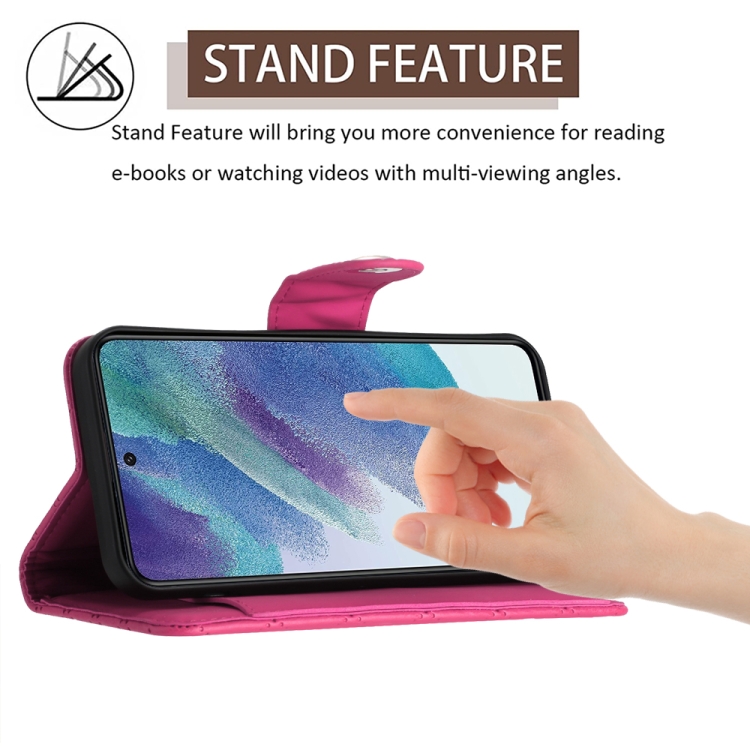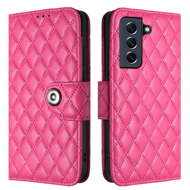 Funda para Teléfono Samsung Galaxy S21 FE 5G con Tapa de Cuero Textura Romboidal y Cordón (Rojo Rosa)