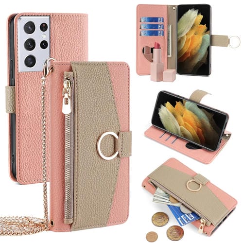 Funda para Samsung Galaxy S21 Ultra 5G Crossbody Cuero Textura Litchi (Rosa)