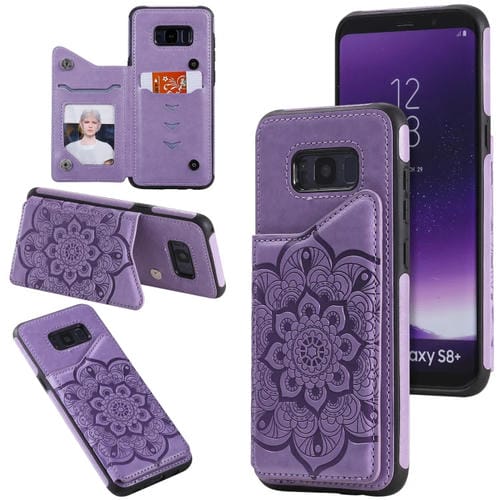 Estuche protector Samsung Galaxy S8 Plus Flower patrón grabado en relieve a prueba de golpes con soporte y ranuras para tarjetas (Púrpura)