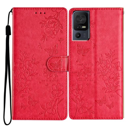 Funda de Cuero para TCL 40 Se Butterfly Love Flower en Relieve (Rojo)