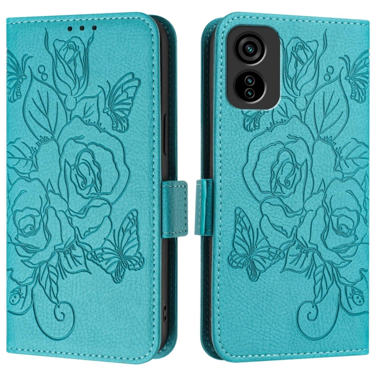Estuche para Teléfono Tecno Pop 6C Cuero Antirrobo RFID con Rosa en Relieve (Azul Claro)