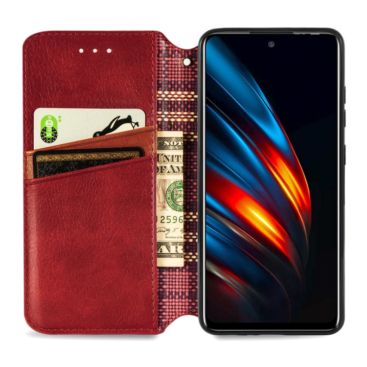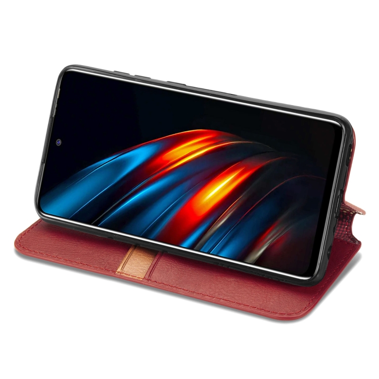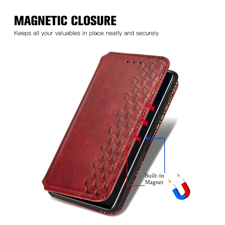 Funda de Cuero Magnética para Tecno Pova 2 con Rejilla Cúbica, Giro Horizontal, Soporte y Ranuras para Tarjetas (Rojo)