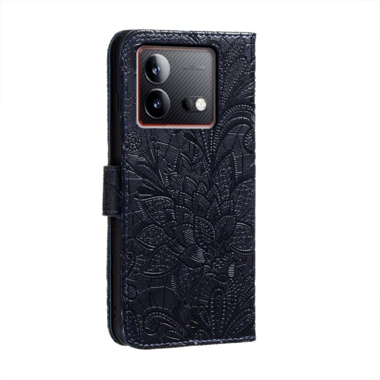 Para Vivo Iqoo Neo8 Funda para Teléfono de Cuero con Tapa y Estampado de Flores de Encaje (Azul Oscuro)