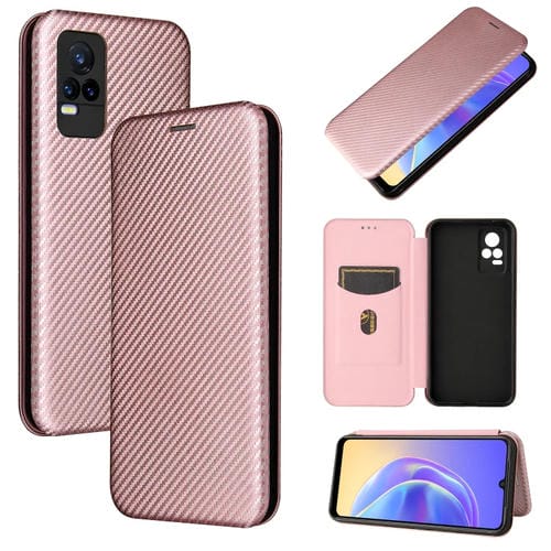 Para Vivo V21E Fibra de Carbono Textura Magnético Horizontal Flip TPU + PC + Funda de Cuero Pu con Ranura para Tarjeta (Rosa)