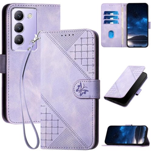 Para Vivo V30 Lite 5G India Yx0080 Funda de Cuero con Tapa y Patrón En Relieve de Mariposa En Cuadrícula con Cordón (Morado Claro)