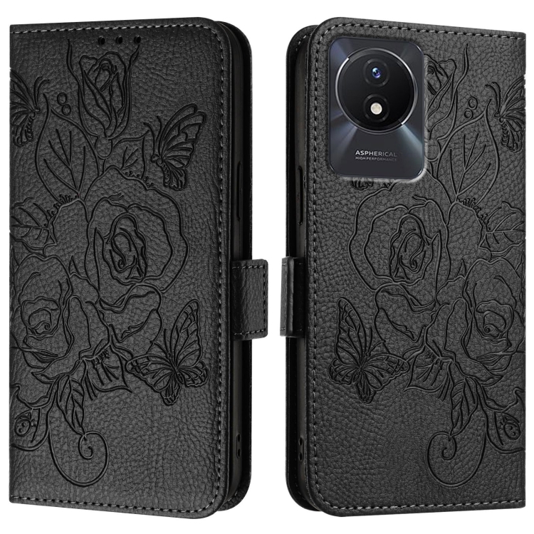 Para Vivo Y02 / Y02A / Y02T / Y11 2023 Funda para Teléfono de Cuero Antirrobo Rfid con Rosa En Relieve (Negro)