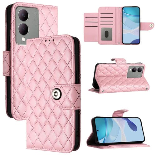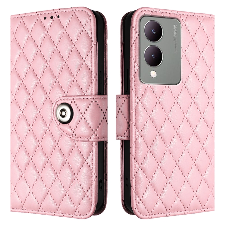 Para Vivo Y17S 4G / Y17S 5G India Funda para Teléfono de Cuero con Tapa con Textura Rómbica y Cordón (Rosa)