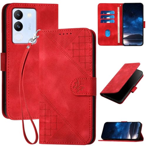Para Vivo Y200 5G Global Yx0080 Grid Butterfly Patrón En Relieve Funda de Cuero con Tapa para Teléfono con Cordón (Rojo)