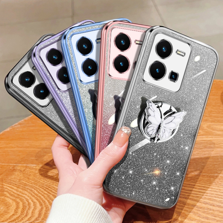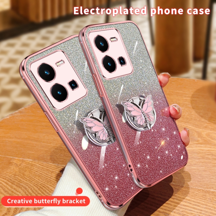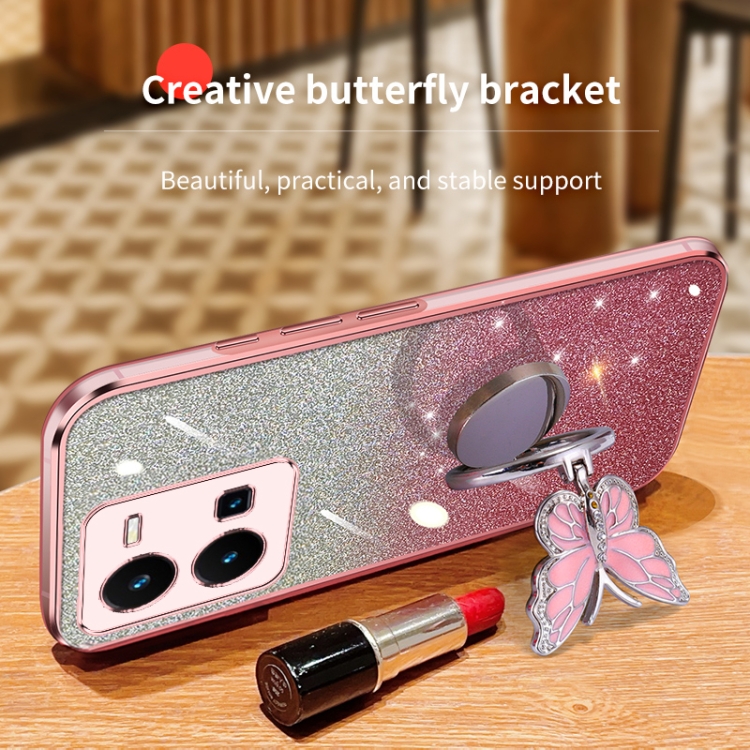 Para Vivo Y35 Global 2022 Estuche para Teléfono de TPU con Soporte de Mariposa con Brillo Degradado Plateado (Rosa)