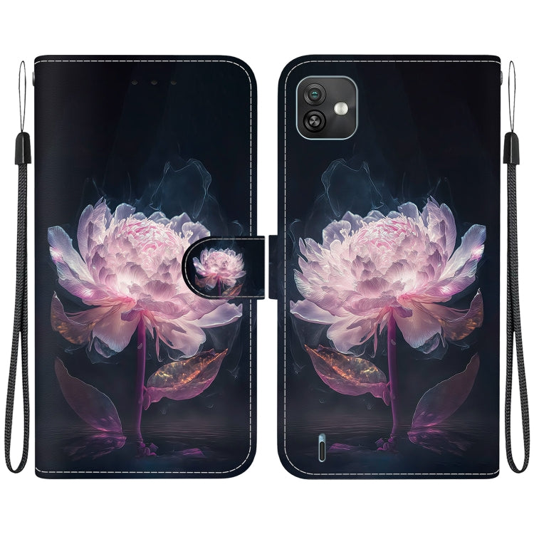 Estuche de Cuero para Wiko Y82 con Dibujo Coloreado y Textura de Cristal (Peonía Púrpura)