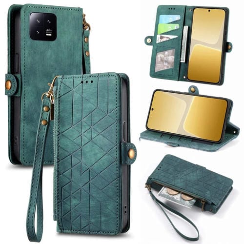 Para Xiaomi 13 Funda de Teléfono de Cuero con Hebilla Lateral de Billetera con Cremallera Geométrica (Verde)