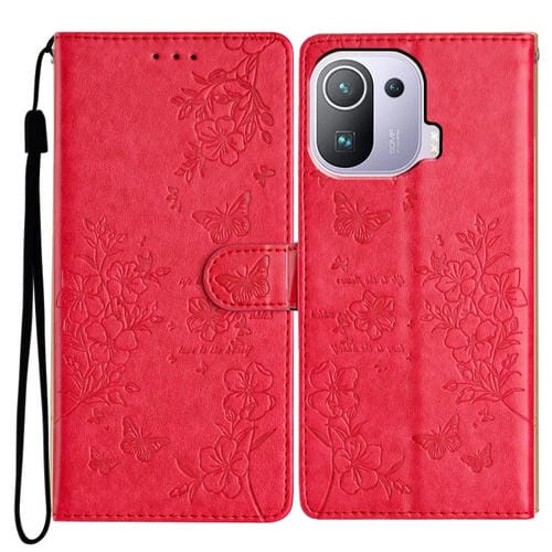 Para Xiaomi Mi 11 Pro Funda de Cuero para Teléfono con Mariposas y Flores (Rojo)
