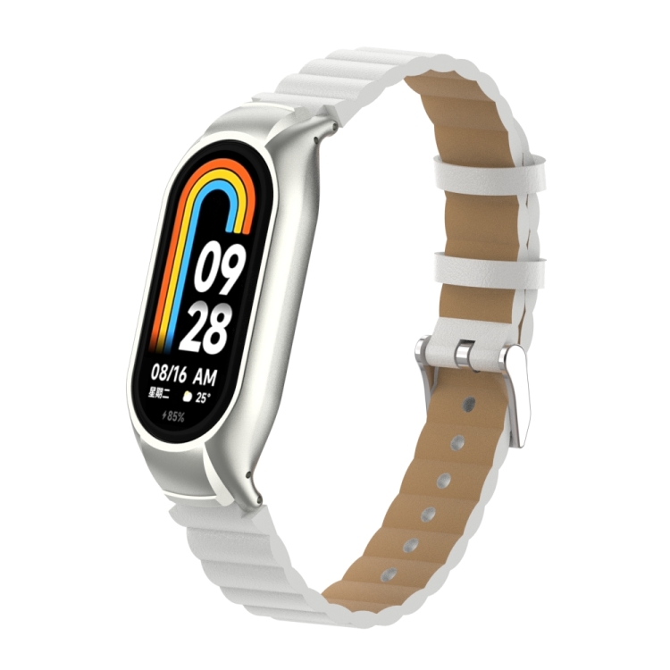 Estuche de Metal integrado con Correa de Cuero de Bambú para Xiaomi Mi Band 8 (Blanco)
