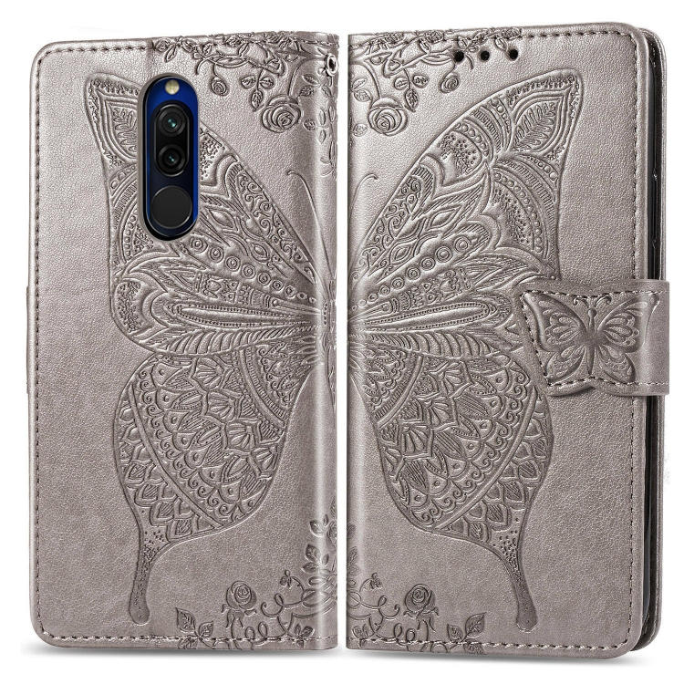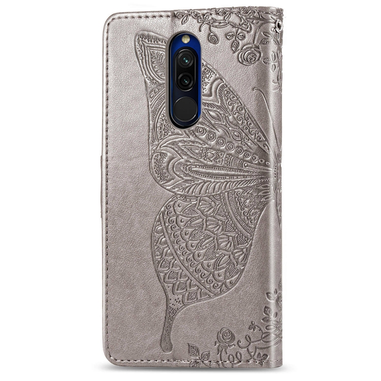 Para Xiaomi Redmi 8 Butterfly Love Flower Estuche de Cuero con Tapa Horizontal En Relieve con Soporte Ranura para Tarjeta con Cordón Monedero (Gris)