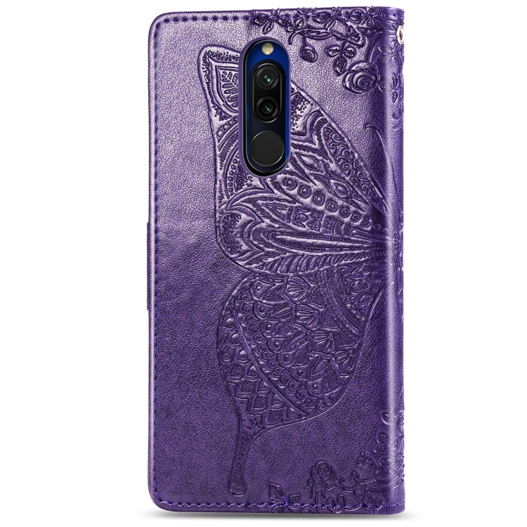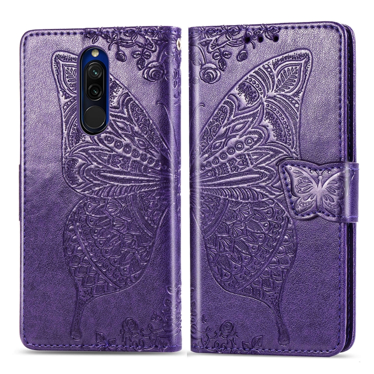 Para Xiaomi Redmi 8 Butterfly Love Flower Funda de Cuero con Tapa Horizontal En Relieve con Soporte Ranura para Tarjeta con Cordón Monedero (Morado Oscuro)
