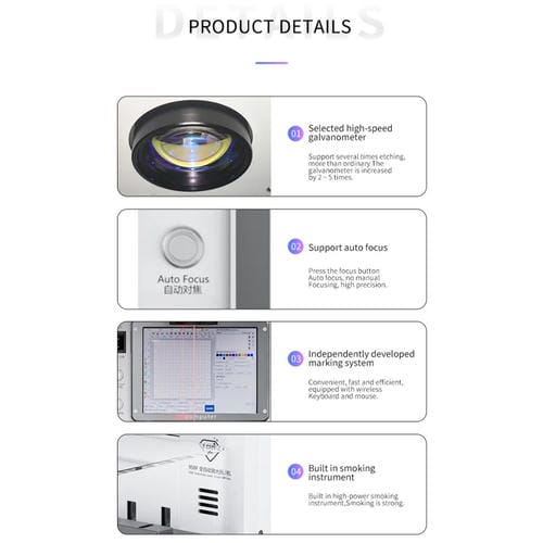 • Potencia de láser: 20W; Longitud de onda: 1064 nm; Tamaño: 42,5 x 24 x 46 cm; Profundidad de marcado: 0,015-0,5 mm; Formato de marcado: 175 x 175 mm; Enchufe del Reino Unido